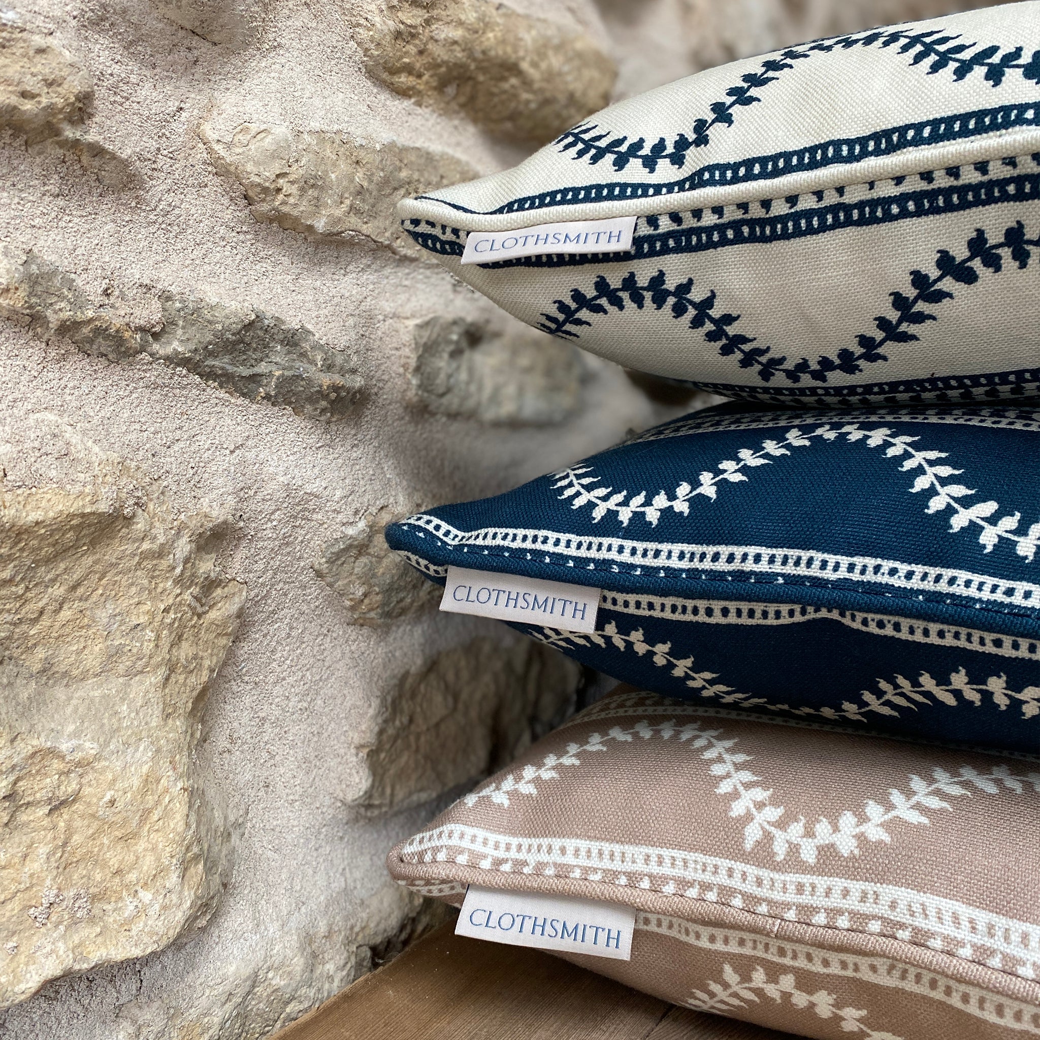 - A rectangular cushion cover in our Odette pattern, featuring delicate garland detailing. A simpler take on our Renee design.